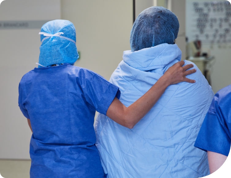 Vous arrivez le matin même de l’intervention et êtes accompagnée jusqu’au salon d’accueil du bloc opératoire. L’équipe chirurgicale composée d’infirmier(e) et de votre chirurgien vous accompagne à pied jusqu’en salle d’opération. L’équipe vérifiera votre identité et tous les éléments nécessaires à votre sécurité.